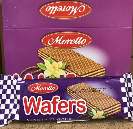 Finas laminas de barquillo relleno de vainilla, empaquetado. Además es un producto que cumple con la normativa HALAL.